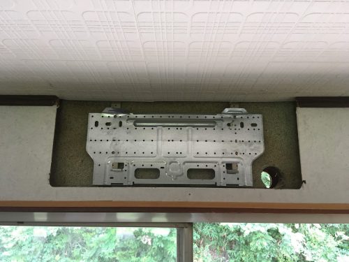 バキバキと引っ張りながらなんとか取り外すことが出来ました。さてこの先新しいエアコンをどうやって取り付けるかが問題です。同じ寸法ではないのでこのまま取り付ける事は出来ません。