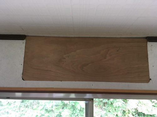 そこで、見た目とこの先の事を考えてガッポリ穴の開いた部分に下地をして周りの壁と同じ厚みの合板を加工して下準備をしました。