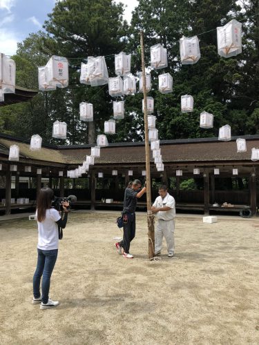 午後からは楼門前の提灯配線を配置していきます。配線を伸ばしたり引っ掛ける作業は氏子青年皆さんが行ってくれます。と、言いつつ僕も氏子青年メンバーなのですが(笑)