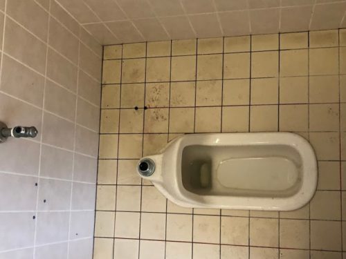 さてこの和式トイレをどうやって外すのか??周りのタイルを割って掘り下げて便器を取り除くのですが、必要最小限のタイルを取り除くためにグラインダーで切れ目を入れます。