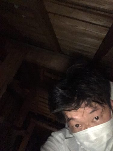 決して怪しい者ではありませんし風邪もひいてません。喉の調子が悪くてホコリを吸い込むと喉がガラガラになるのでマスクマンで天井裏侵入です。モチロン暑さ倍増!