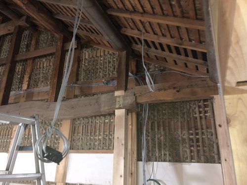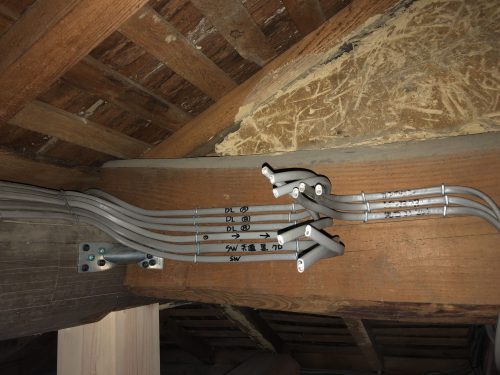 配線が隠せる場所にピンポイントで通していきます。ここ最近町家を改装した古民家風お洒落なカフェとかに行くとついつい電気配線を見てしまいますが、電気配線むき出しでエアコン配管などもこだわりなく丸見えになっていると残念な気持ちになってしまいます。