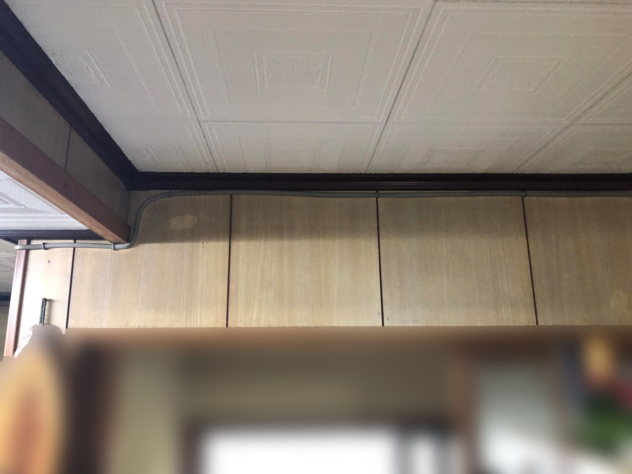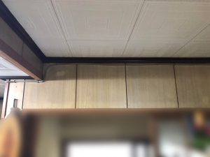 奥まった場所から勝手口の垂れ壁の上に付けられないかと相談を受けました。確かに僕が見てもこの場所にエアコンをつけた方が部屋全体に風が行き渡り理想の場所だと思いました。問題は高さ方向に余裕がないので、標準的な高さ(約300mm)のエアコンは取付出来ない事でした。