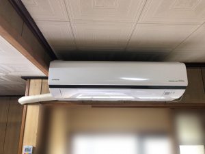 室内機を無事に取り付ける事が出来ました。配管は見えても構わないと仰っていましたのでテープ巻きで出来るだけ綺麗に仕上げをさせて頂きました。