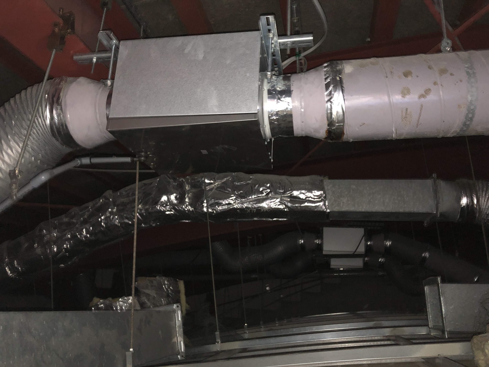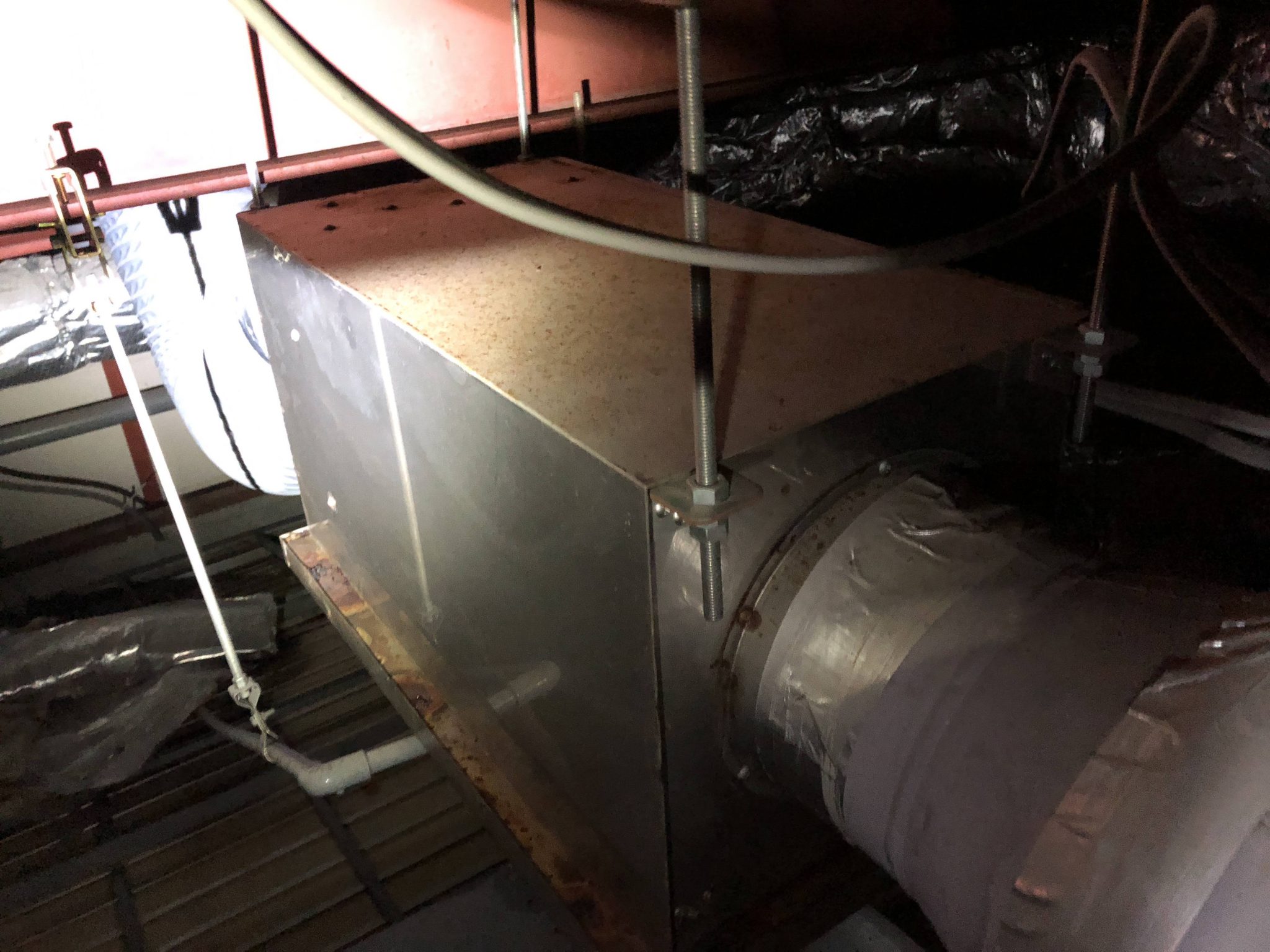 その換気扇はこんな場所に設置されていました。3台のダクト換気扇をどうやって取替えるか・・・安全面を考えると無理は出来ません。