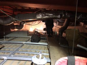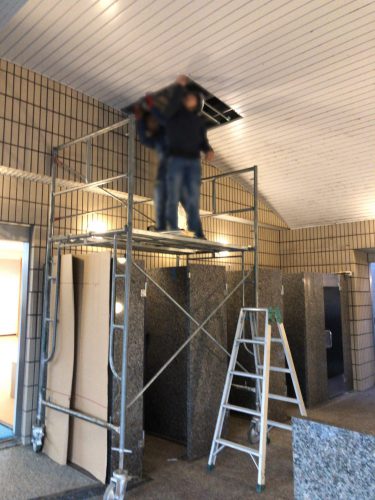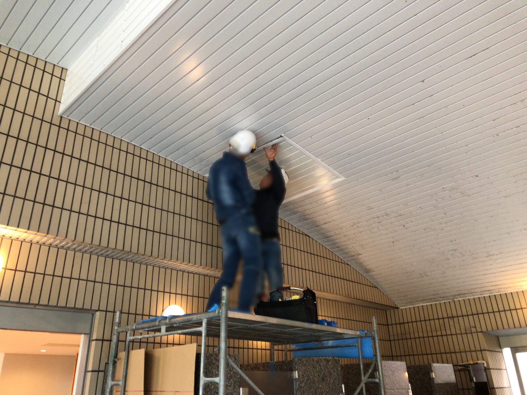 先日、大浴場に設置されていた天井裏の換気扇の交換をさせて頂きました。天井の強度と換気扇の重さの問題で既存の点検口から搬出は無理だと判断して違う方法での工事をさせて頂きました。