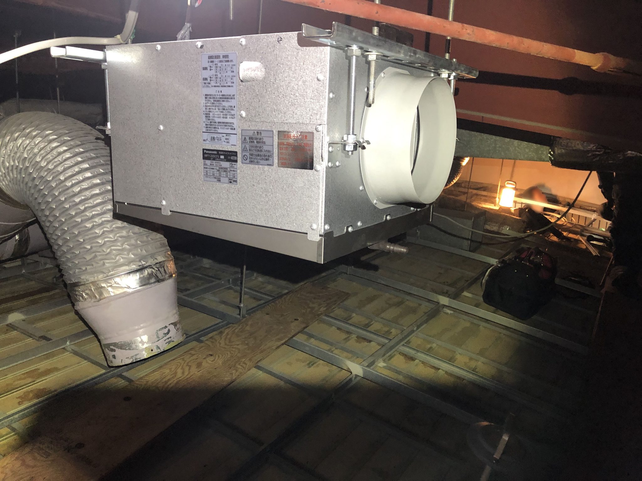 古い換気扇の配管が固着してなかなか外れませんでしたが何とか外すことが出来ました。新しい換気扇はコンパクトになっており、事前に制作していたアタッチメントを取付て既定の位置に吊るすことが出来ました。