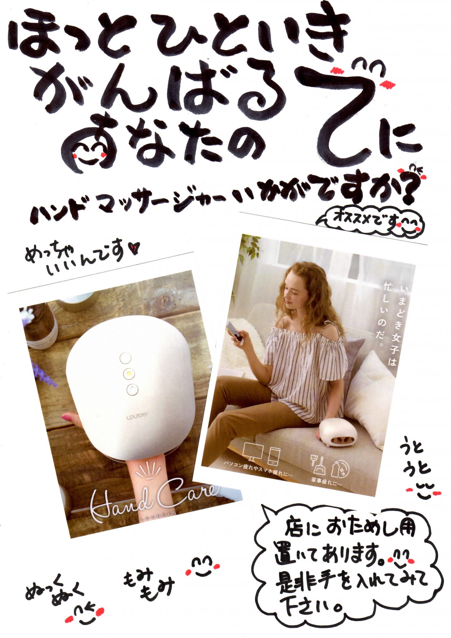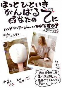 そして今日のナンバーワン商品はハンドマッサージャーでした。お試しも目的で来店いただいて即購入いただいた方、衝動買いの方、手の冷えや痛みが和らぐと喜んで頂いている商品です。