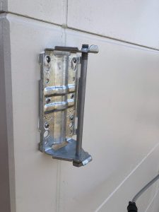 固定金具を壁面に取り付けるときにネジ穴から雨水が侵入しないようシーリング材を塗り込んでおきます。勿論ネジは外壁に利かせるのではなくその下地材にしっかり届く位置に取り付けました。