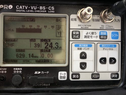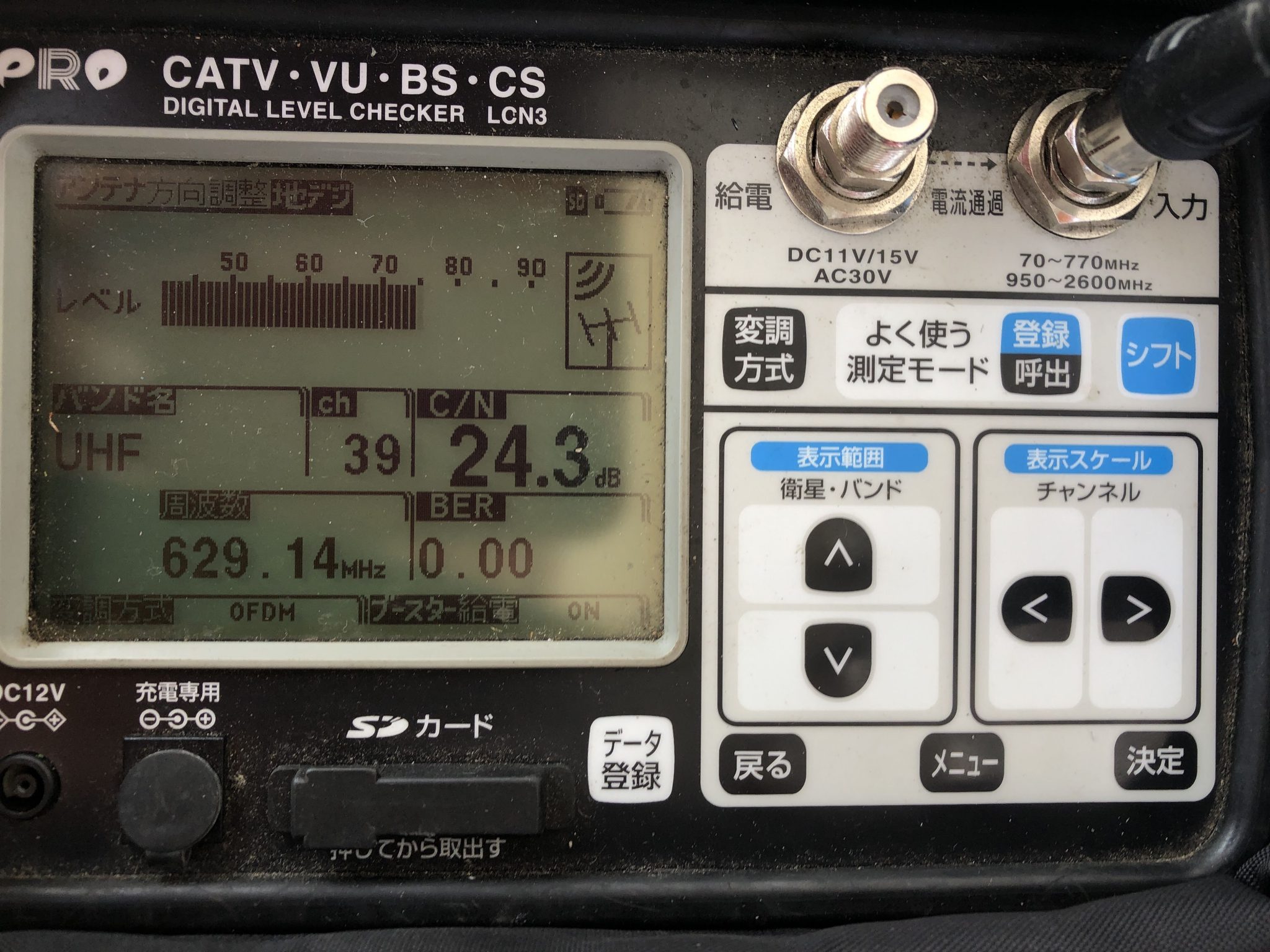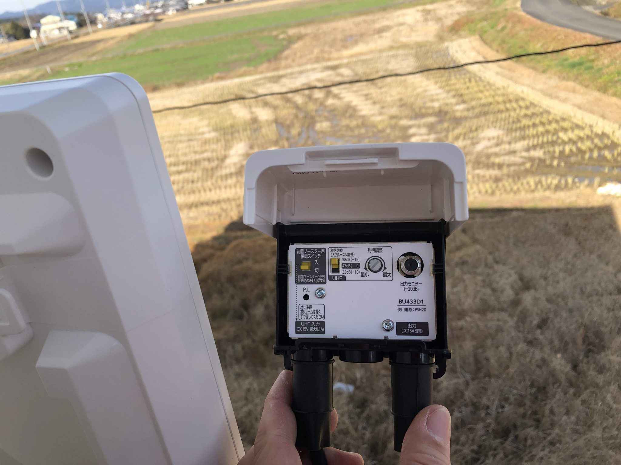 アンテナの方向調整と同時にブースターの増幅設定をします。ブースターが無くても視聴できるほど条件は良いのですが、宅内の分配数が多いのと悪天候時にも安定受信が出来るよう取付させていただきました。