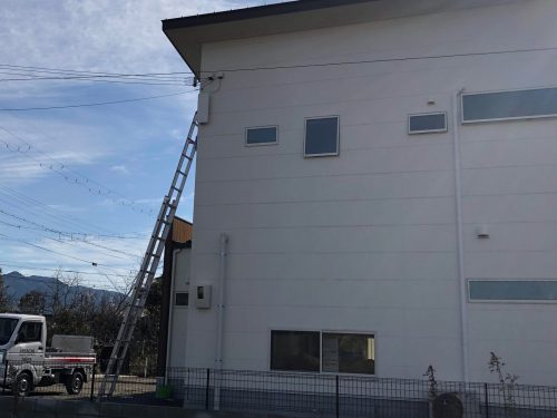 明日から天気が下り坂の予報なので他の予定を調整して本日晴天の中工事をさせて頂きました。真っ白な外壁を汚さないよう梯子の養生もしっかりと行います。