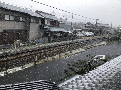 明け方に結構な雨が降っていましたが、7時頃から雪模様になってきました。みるみる景色が白くなってきます。