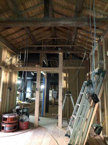 古民家は梁が見える部分が多く、見せる場所と隠れる場所を間違わないように配線する事も大切です。明日も引き続き通信配線と幹線工事を頑張ります!!