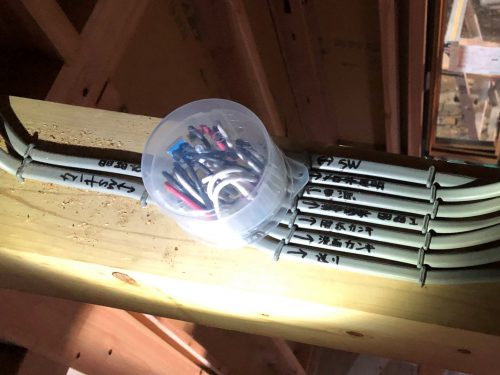 コンセント周りは先週までに終わっていたので今日は照明配線を仕上げました。