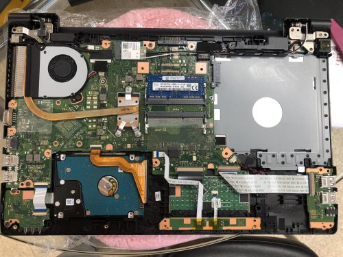 では、早速ご依頼ただいたSSD化を行います。新品のノートパソコンを分解するのは若干緊張しますが丁寧に作業します。左下に見えるHDDを取り出します。