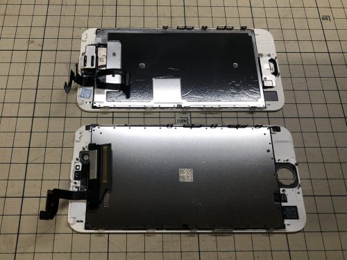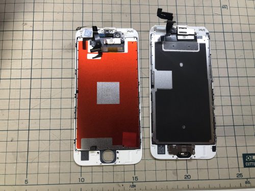 左が新しいフロントパネルで右が割れたフロントパネル。カメラとスピーカーとセンサーとボタンを移植します。