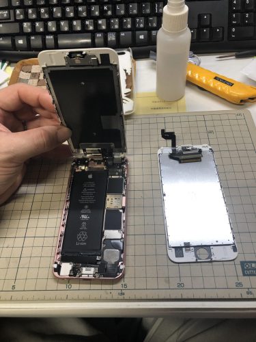 早速修理に取り掛かります。こんな部品を使ってフロントパネルを外していきます。当店はiPhone修理店ではありませんので詳しい作業は省かせてください。