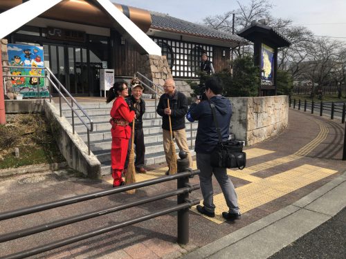 地元の方へのインタビューシーン。区長さんも参加していただく事が出来ました。チラッと見える赤いくノ一はみかん🍊さん。