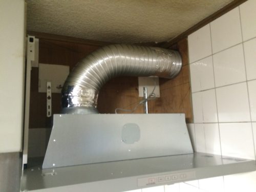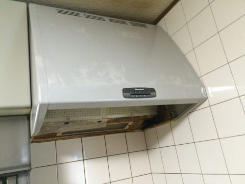 こんな感じの古いレンジフード。掃除しても汚れが気になるし最もお手入れが楽な今風のレンジフードに変えたいというご要望で交換させて頂きました。