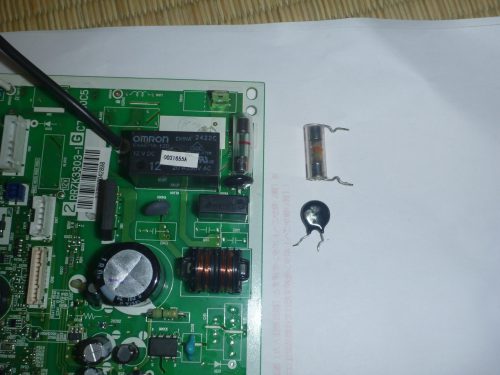 幸いな事にエアコンに過電圧をかけた場合はバリスタという部品がショート状態となり、ヒューズを溶断して回路の保護を行うようになっています。今回もこの二つの部品を取り換えて壊れたエアコンは元通りとなりました。
