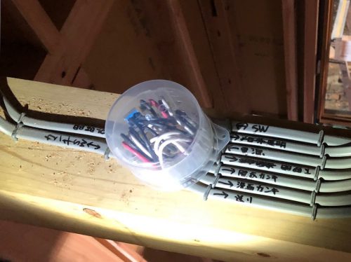 普通であればスイッチや照明器具の近くでこのように結線を済ましてしまうのですが、梁見せの新築や古民家リフォームの場合は真壁と言って柱が見える場合が多いです。そうなると結線場所を隠す場所がなくなるので結線場所を懐のある場所に集めて来て纏めて結線する事になります。