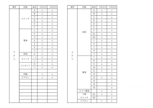 結線場所に必要な線が全てあるか確認できるようこのような表を作って作業毎に確認しています。誰が作業しても分かるようにする為の工夫です。