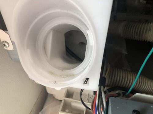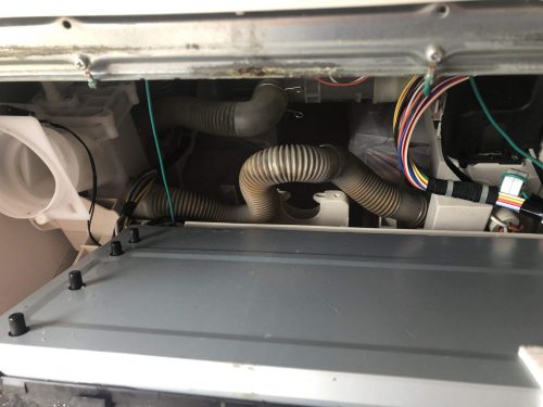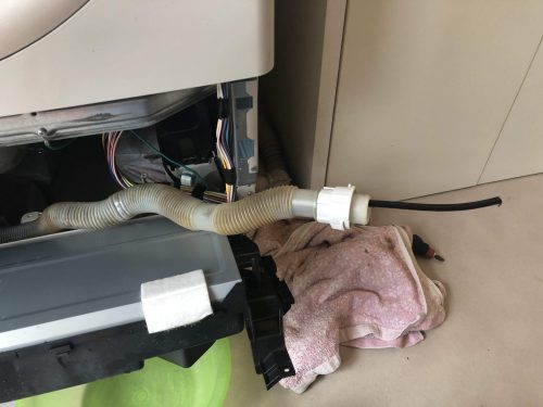 早速ドラム式洗濯機の下半身を外して排水機構部を確認すると排水弁は開いているのに水が流れていませんでした。ドラム式洗濯機に限らず洗濯機の排水は左右どちらからも取れるようになっているのですが、最初に設置するときに左右位置を変更した時にホースの曲げが極端になっていてゴミが溜まっているような感じを受けました。