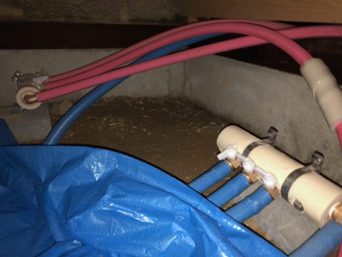 今まで給水、給湯、排水がない場所へ洗面化粧台を設置するので新たに配管します。