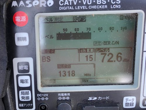 まずはリビングのテレビコンセントで測定器を使って確認した所BS放送のレベルが全く出ていませんでした。これはアンテナにトラブルがあると思い屋根の上に上がってBSアンテナの根元でレベルを確認。