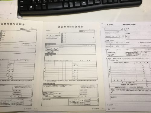この「落雷修理費用証明書」。これを発行しないと火災保険の査定が出来ないのですが、この書類を作成するのが結構大変なんです。当店ではお買い上げいただいた商品がもし落雷で壊れた時にはこの「落雷修理費用証明書」を無償で発行させていただいています。