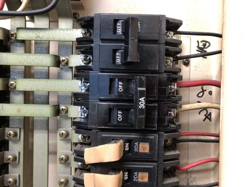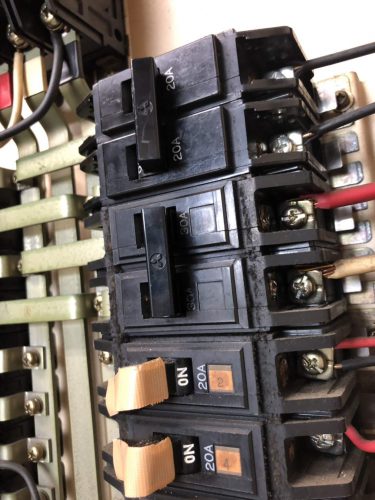 この真ん中のブレーカーから「ジージー」と音がして臭いニオイがしたという事でした。ハンドルの感触からブレーカーの接点が折れてしまったのだと判断しました。帰宅後、早速Faxで同等のブレーカーを発注して入荷次第交換させて頂く段取りにさせて頂きました。