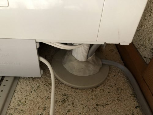 今回は廊下を越えて室外機を設置しますがエアコンの背中に廊下の湿った空気が入らないようにパテでしっかり隙間を塞ぎます。
