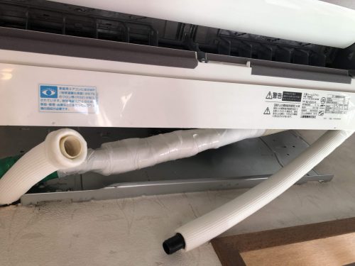 そしてもう一か所の隠蔽配管エアコンの取替。ドレンの施工方法が先ほどと全く違います。ドレンホースの断熱が出来ていなかったので追加施工しました。この前に冷媒配管を延長する際少し短く寸法を取ってしまったようで結果的にそのせいで配管接続部のフレア加工が上手くできずガス漏れしてしまいました。