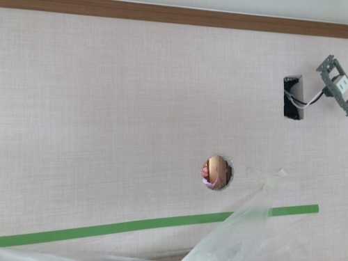 早速施工写真からのスタートですが、窓の上しかエアコンを取り付けるスペースがないので柱に位置に注意して配管穴を開口しました。柱ギリギリの位置でバッチリ!