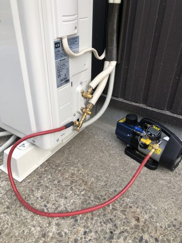 配管接続が完了したら電動真空ポンプを使って配管内の空気を取り除き、真空乾燥を行います。