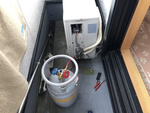 写真がありませんが、冷媒配管が接続できた後には電動真空ポンプを使って配管内を真空乾燥しています。