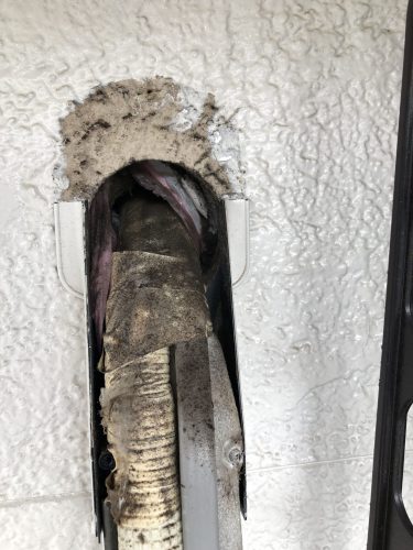 室内機を外すために配管カバーを外すと小動物侵入と湿気が入らないようにする為の貫通スリーブとパテが全く使われていません。室外の湿った空気がエアコンで冷やされた冷気と触れる事で結露が起こりこのようなカビが発生しています。当然エアコン裏側や内部もこのような状態になってしまいます。