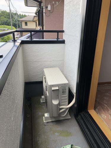 今回は室外機も2階のベランダ置きだったので安全を考慮し、このようなウインチを使って重量物の搬入搬出を行いました。お客様の大切な家にも負担にならない施工を心がけています。