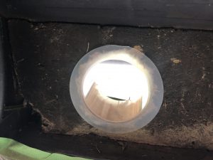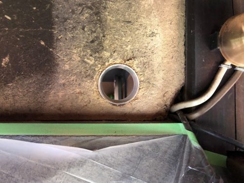 ここでも両方の穴に貫通スリーブを使います。気密を保って小動物と湿気の防ぐ他に配管を通す時に土壁の崩れも防いでくれます。