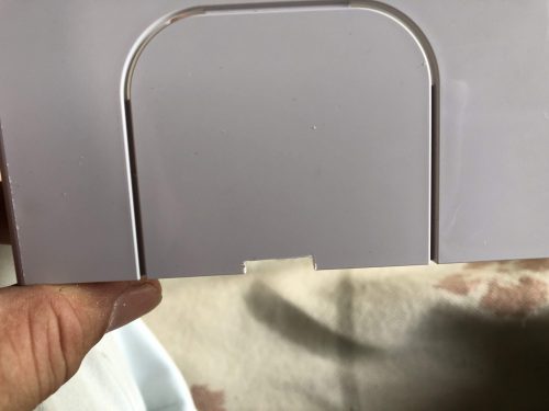 エアコン配管穴を利用して専用コンセントを取り付ける為VVFケーブルが少しだけ干渉するのでこのように切り込みを入れました。入れなくても収まるのですがたったこれだけの事で見た目の歪みをなおすことが出来ます。