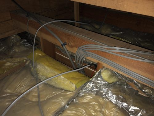 同時進行でユニットバス点検口から天井裏に入ってエアコン専用コンセントの工事を行います。真夏ほどではないですが天井裏に居ると汗が噴き出してきました。