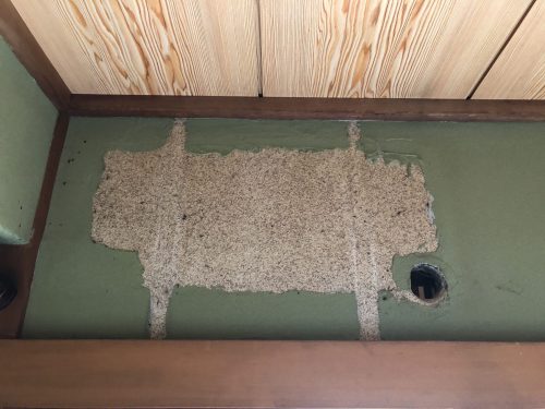 既存の開口部分が段違いになっていていつも使っている貫通スリーブが使えなかった為に湿気の防止と小動物侵入防止の為にエアコンの真裏で気密保持用のパテを使いました。
