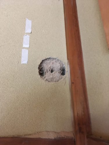 上手く配線を避けて穴あけが出来ました。美観を意識してもう一か所穴あけです。