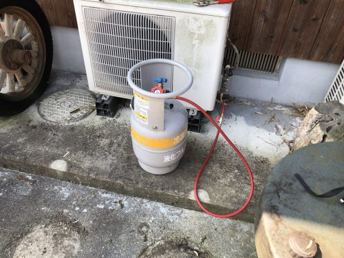 隠蔽配管エアコンは外してみてから「あれ??!!」という事があります。まずはコンプレッサーが動かないのでフロンガス回収を行います。