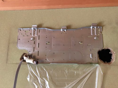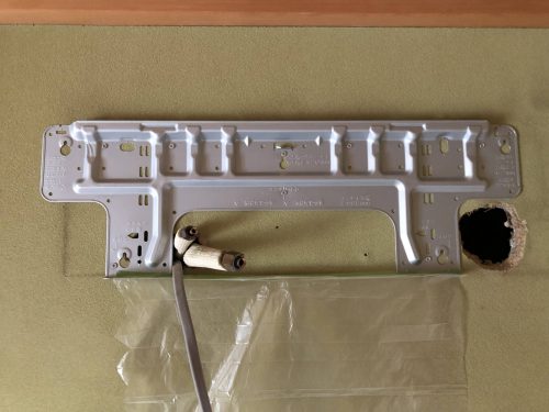 新しいエアコンの背板を取り付けてみました。どう考えても冷媒配管の接続が出来そうにありません。