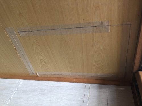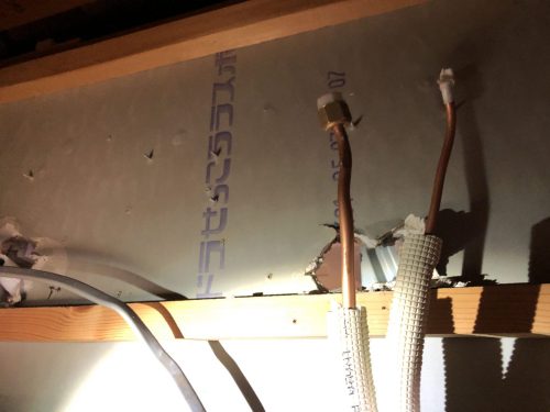 しかし、下見の時にこのような事態も考えて次の一手に出る事が出来ました。このエアコンの反対面は収納庫の天井裏でそこを開口すれば配管の部分的な修繕も出来ると思っていました。