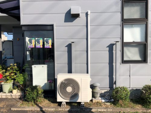 今まで設置されていたガスエアコンが調子悪く設置場所を変えて急遽の取替です。今日は分電盤からの電気工事もあり天井を外したりする作業があったので休みの弟にも手伝ってもらいました。