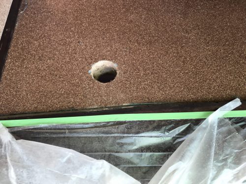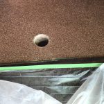 縦さんをしっかりと固定してそこにエアコンを取付ける背板を固定します。配管穴をいきなり開けると壁が崩れ落ちるので目印のセンター穴を開けて表と裏と両方から開口します。