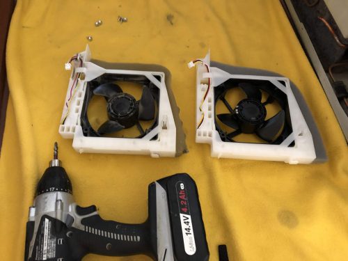 先ほどの熱交換器に風を送っているファンです。これが動かないというエラーでしたが、あれだけ目詰まりしていては動いても動かなくても同じような感じがしますが交換してエラーが出ない事を確認しました。