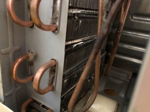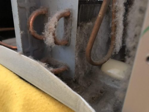 もう一軒のお客様は、冷蔵庫の放熱異常のエラーが出ていたので部品を手配して訪問させて頂きました。背面板を外すと放熱部品にもスゴイ埃が付いています。これでは熱交換が出来ません。